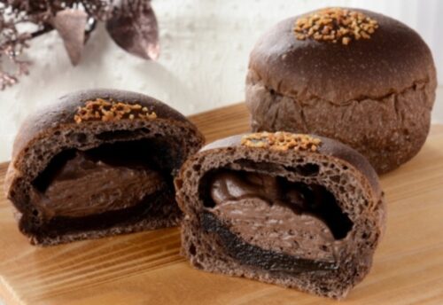 しっとり食感のチョコパン生地とココアビスケット生地で、濃厚なベルギー産チョコと口どけの良いチョコホイップを包みました。食べる場所によって「濃厚チョコ」と「クリーミーなチョコ」が楽しめます。